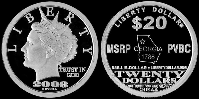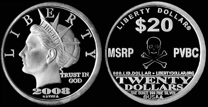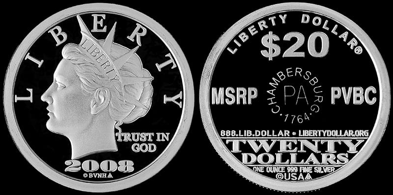 Commonly called “naked backs,” these pieces were issued without the standard Liberty Dollar reverse design, leaving a blank surface specifically intended for hallmarking. This variation emerged after the federal raid in late 2007 interrupted centralized production/distribution and forced the Liberty Dollar operation into a more fragmented, region-based model.
